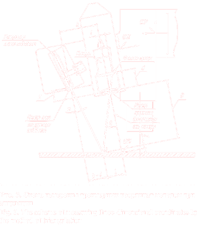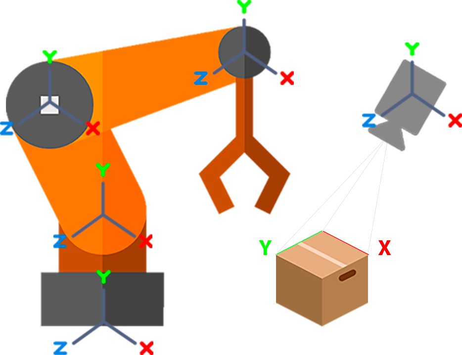 На рисунке стереосенсор установлен неподвижно над рабочей зоной. Для работы с координатами, нам нужно определиться с системами координат. Основание робота является началом отсчёта базовой системы координат (Xa, Ya, Za). Облако точек объекта измеряется стереоскопической системой технического зрения (СТЗ) и определяются в собственной системе координат устройства (Xb, Yb, Zb). Далее, используя полученную ранее методом взаимной калибровки матрицу преобразований, производится преобразование координат из системы координат камеры (Xb, Yb, Zb) в систему координат промышленного робота (Xa, Ya, Za)